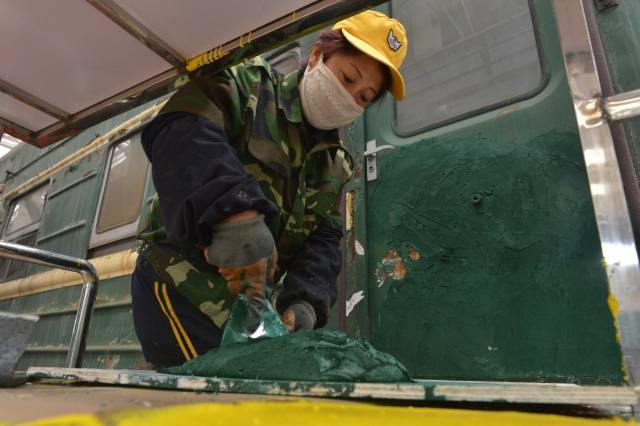 第二道工序是刮腻子。为了便于修复,车皮上每一破损处的石膏、腻子至少需要刮两遍,再用砂纸打磨,最后还要刷上一层油腻子。完成这道工序时,女工们要站在车下或踩在两米高的高凳车上,重复着一个单调的动作:左手拿砂纸用力打磨车皮,右手拿铲子刮腻子。